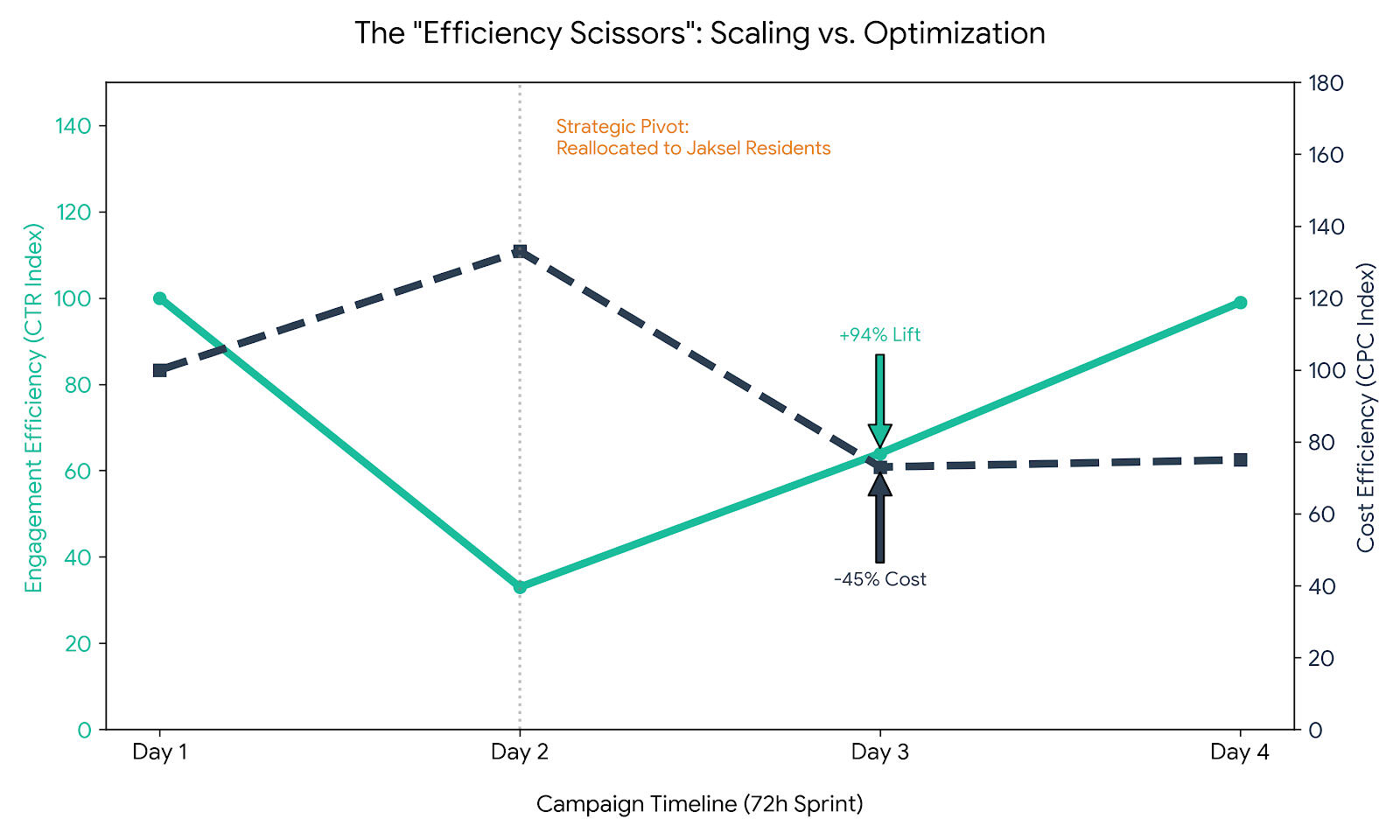 When initial automated bidding caused a "Cost Spike" due to broad targeting, the campaign was shifted from a technical scaling phase to a Strategic Filtering Phase: